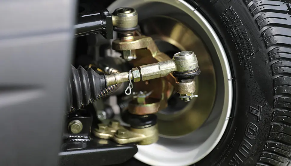 The independent suspension system ensures a stable, comfortable ride by absorbing shocks and uneven terrain. This setup enhances safety, ride quality, and durability across varying course conditions.